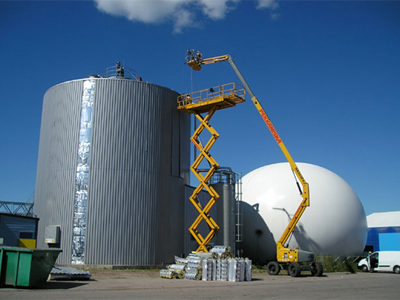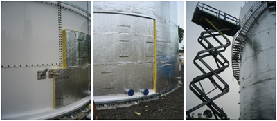 - Gerüstung mit eigenen entwickelten Hebesystemen bis zu 100 m1 (geprüft) und Spezialgeräten. Unsere Systeme können wir auf jeden Behälterumfang anpassen. Zur Zeit entwickeln wir gerade einen eigenen transportablen Leichtbaukran der auch für die schwierigsten Verhältnisse und für jede Höhe konzipiert ist. Wir können mit unseren Systemen auch Abgaskamine mit über 100 m1 Höhe isolieren.